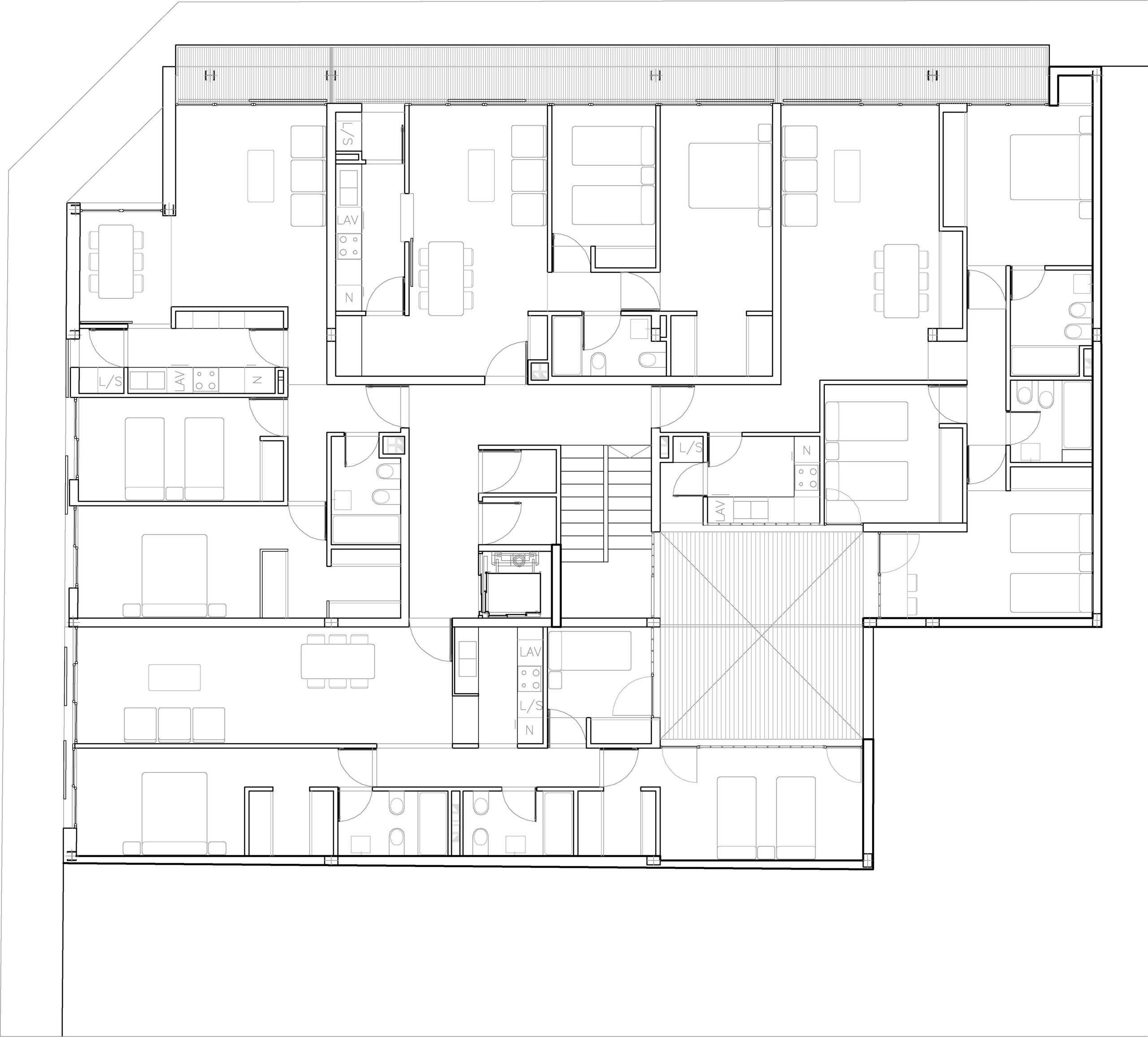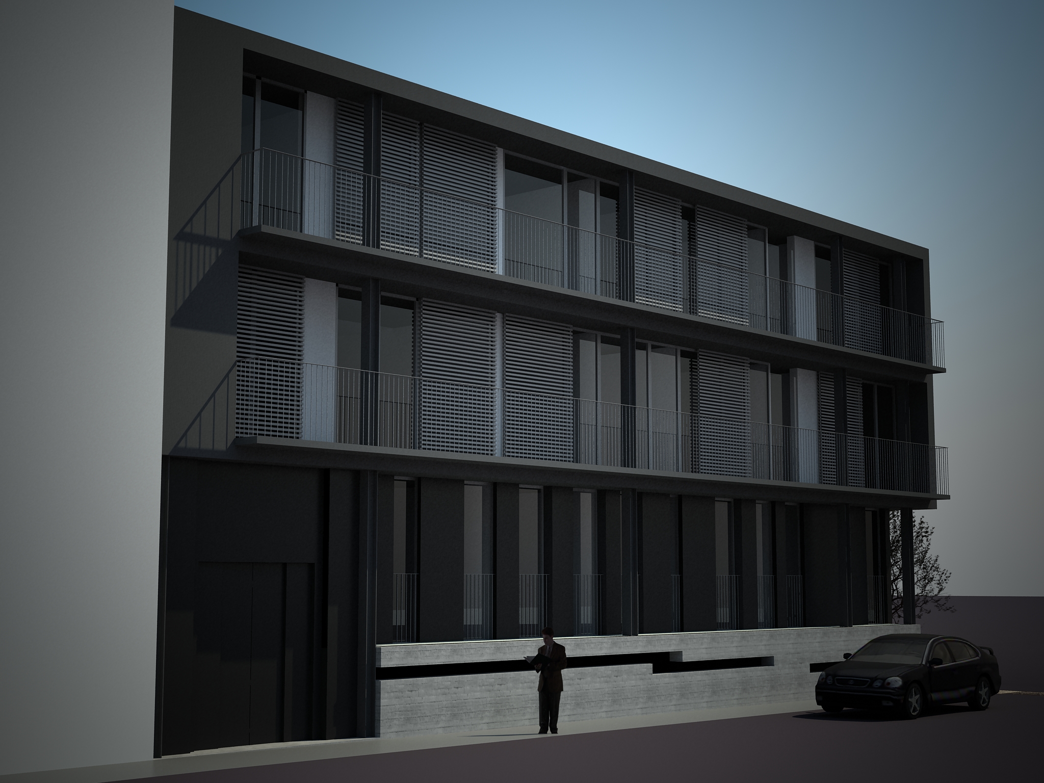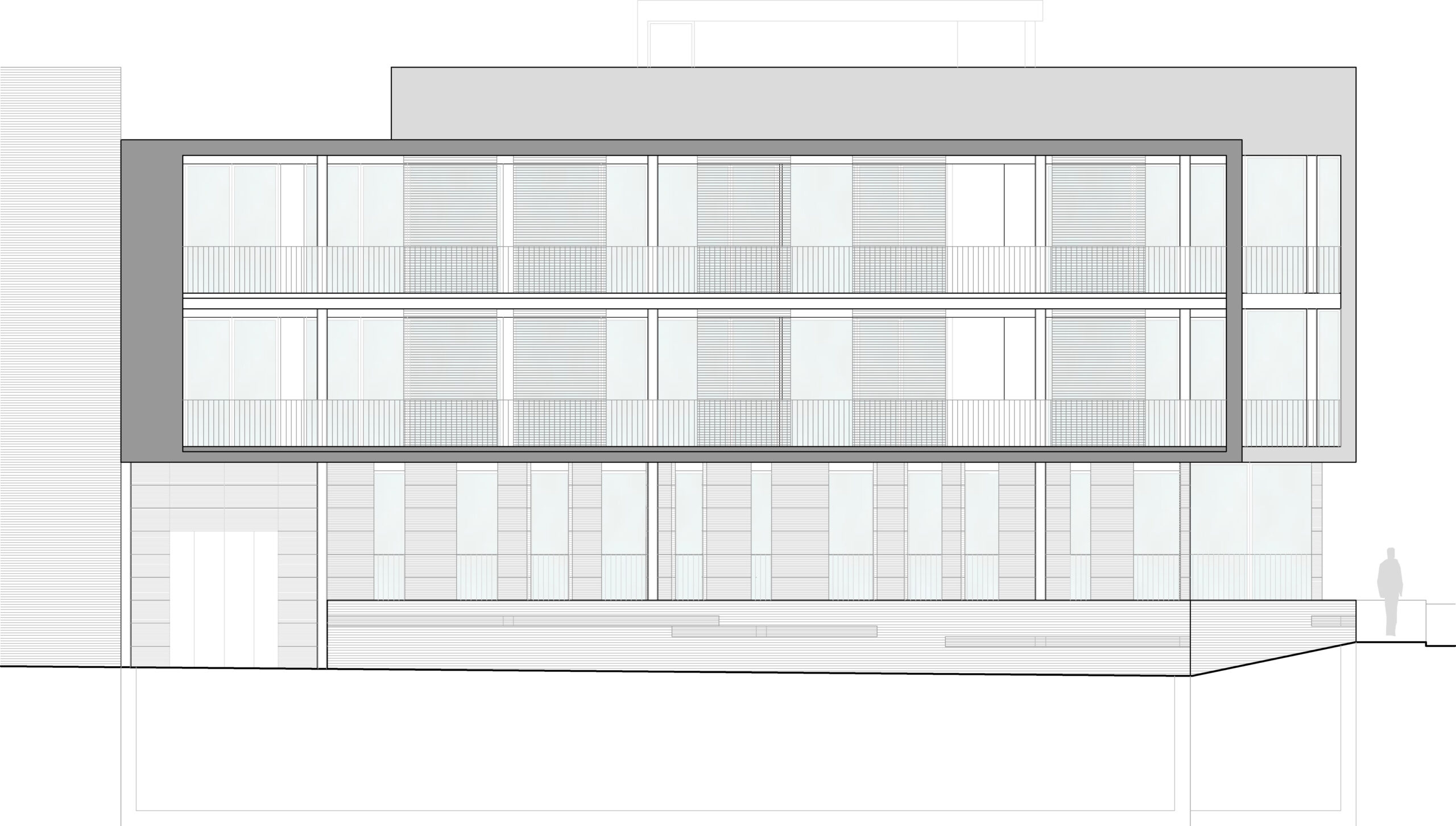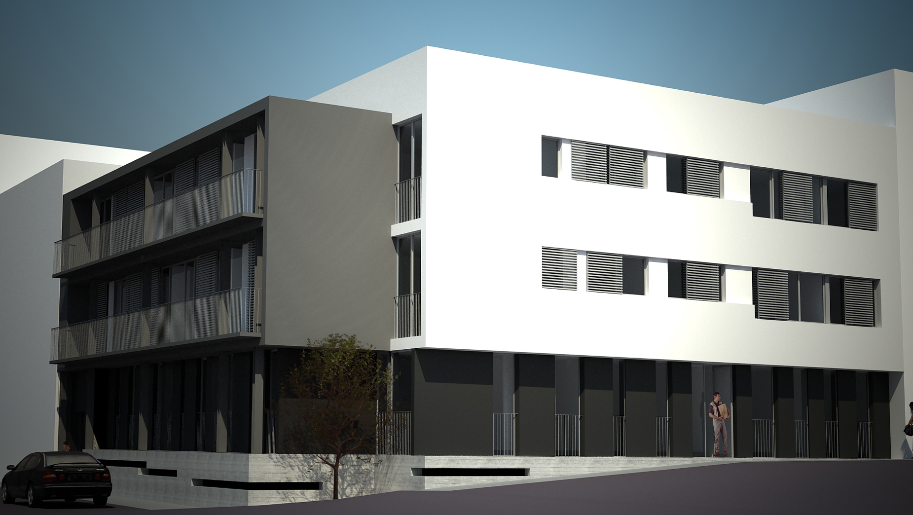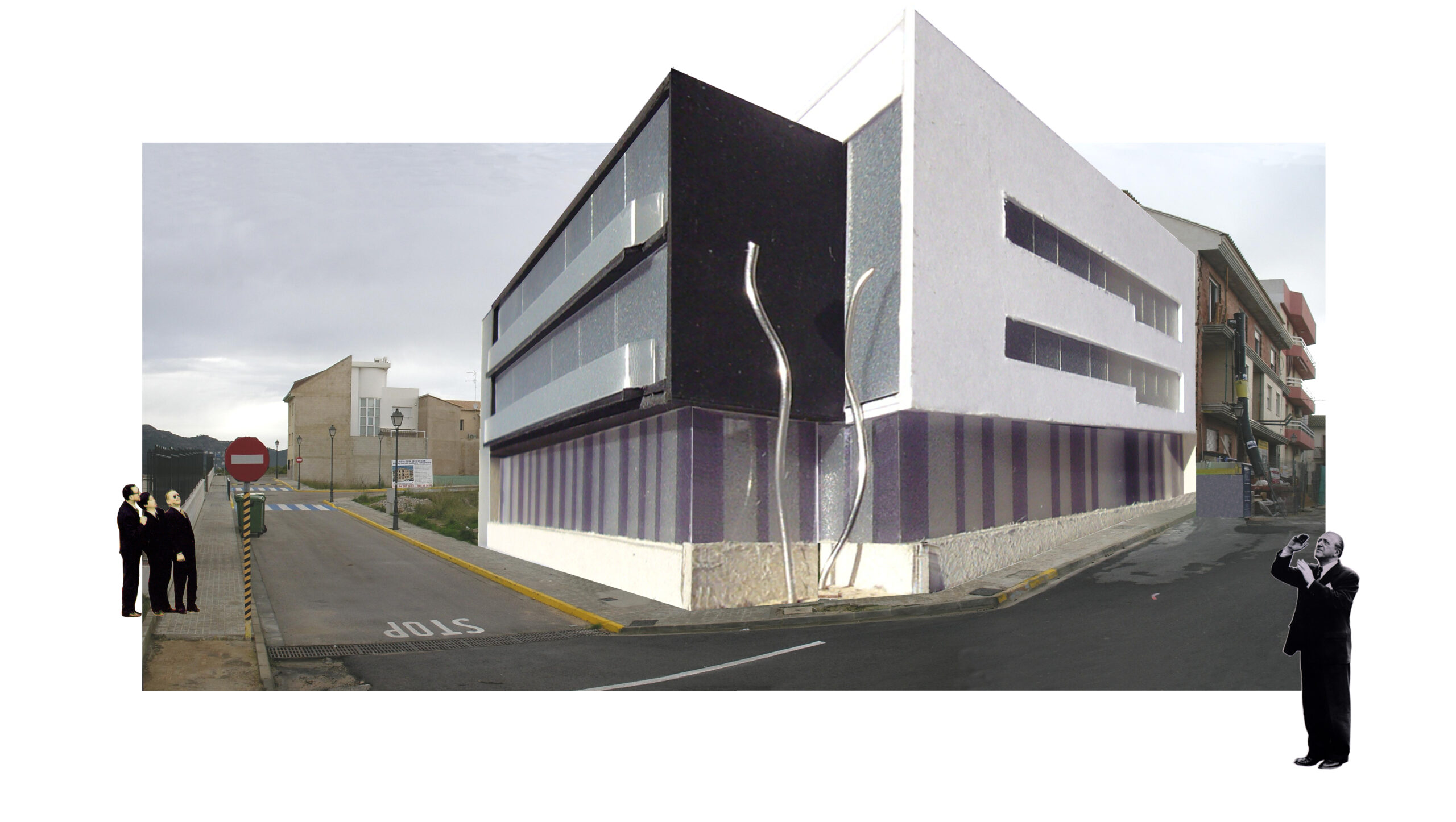 Los 2 volúmenes maclados en diferentes planos se diferencian incluso por sus materiales, texturas y colores; resolviendo la esquina de particular manera que evite un chaflán poco atractivo en el ángulo entre ambas calles. El vacío del chaflán se aprovecha para ajardinar y así visualmente ensanchar la estrecha acera. Dichos volúmenes se depositan sobre el cuerpo de planta baja que también acoge viviendas elevadas sobre un zócalo de hormigón que resuelve los desniveles existentes entre las 2 calles.