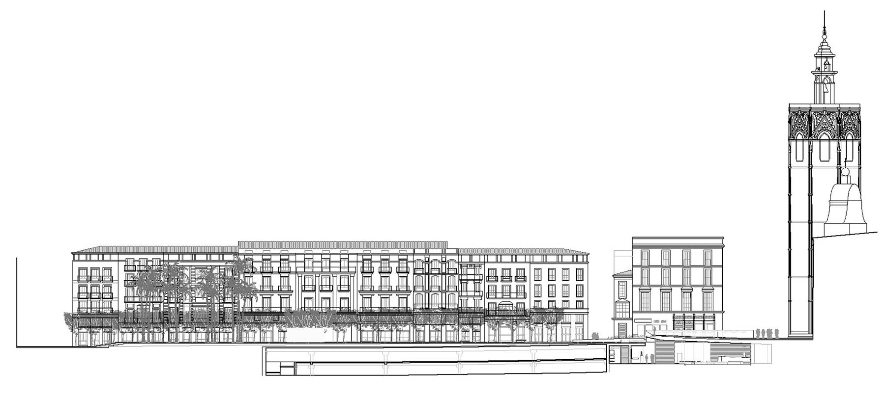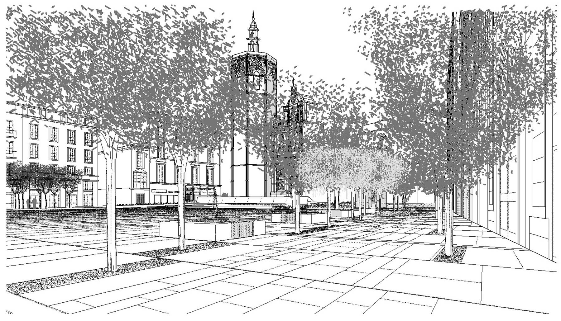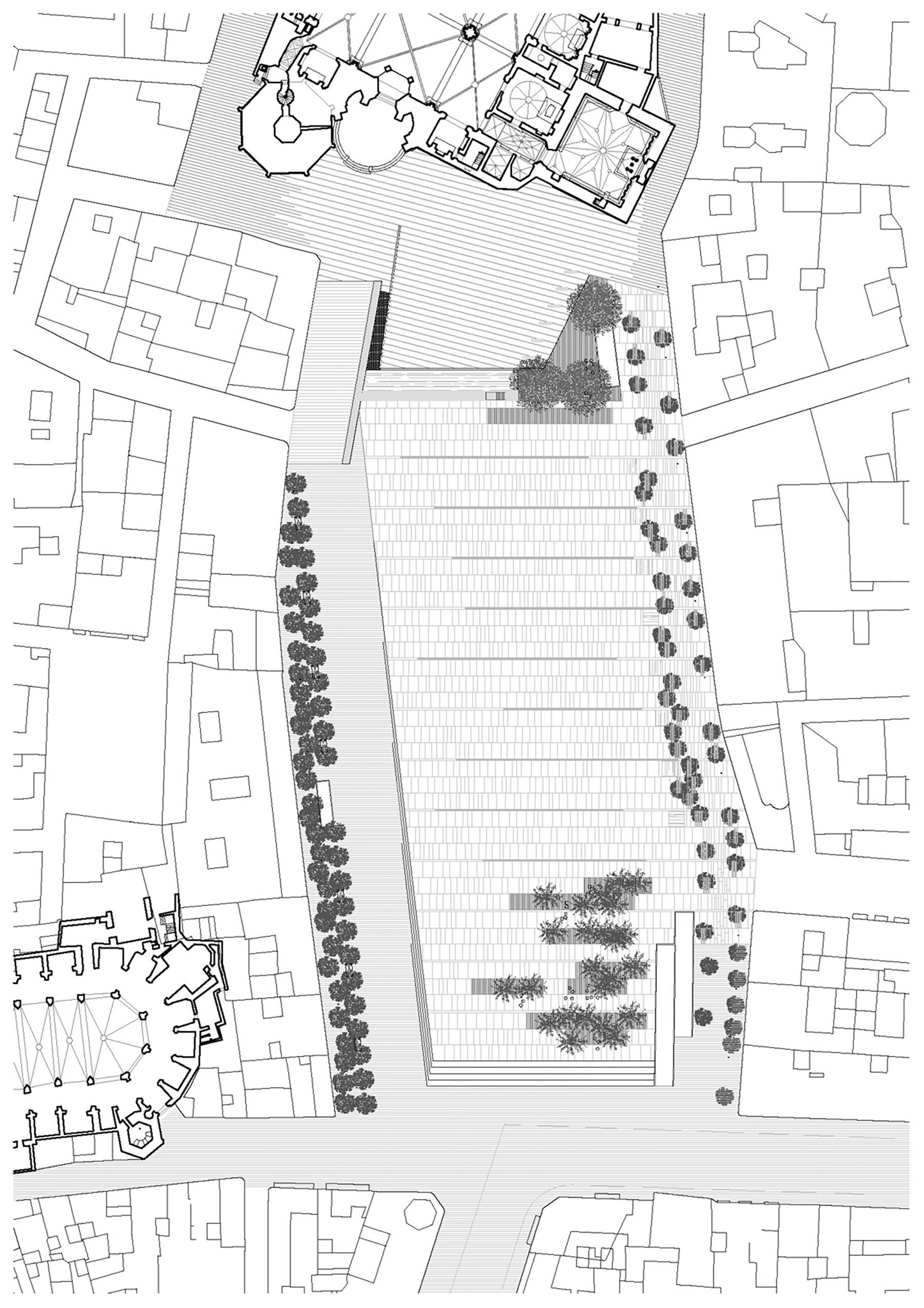 Transformar el gran vacío urbano en una plaza es el reto del concurso. Intentar cierta unidad en lo que fue diverso, a aquello acumulado tras más de 2000 años de construir y reconstruir. Nos apoyamos en la forma, en la geometría, en la preexistencias, en la historia… intentando hacer legible el paso del tiempo, facilitando lecturas de arquitecturas pensadas para ser vistas de manera acotada. El gran vacío se ajusta en dos espacios, uno antestante a la catedral y limitado por la línea de la muralla romana, la cual quedará evidenciada con una gran fisura lineal que marcará su ausencia; una zona arbolada que permita la perspectiva barroca de la Puerta de los Apóstoles. Al sur otro espacio más amplio, la gran plaza civil con un perímetro arbolado que da unidad al conjunto.