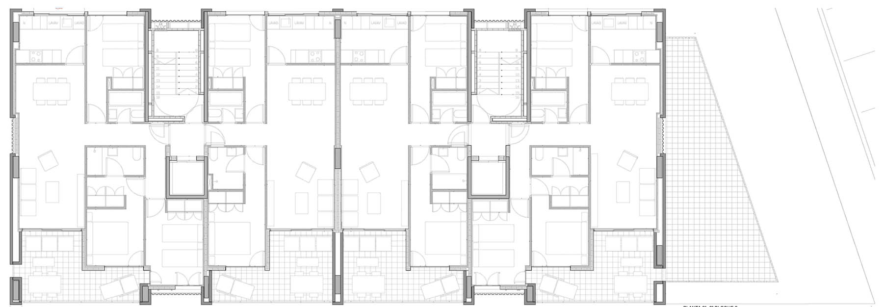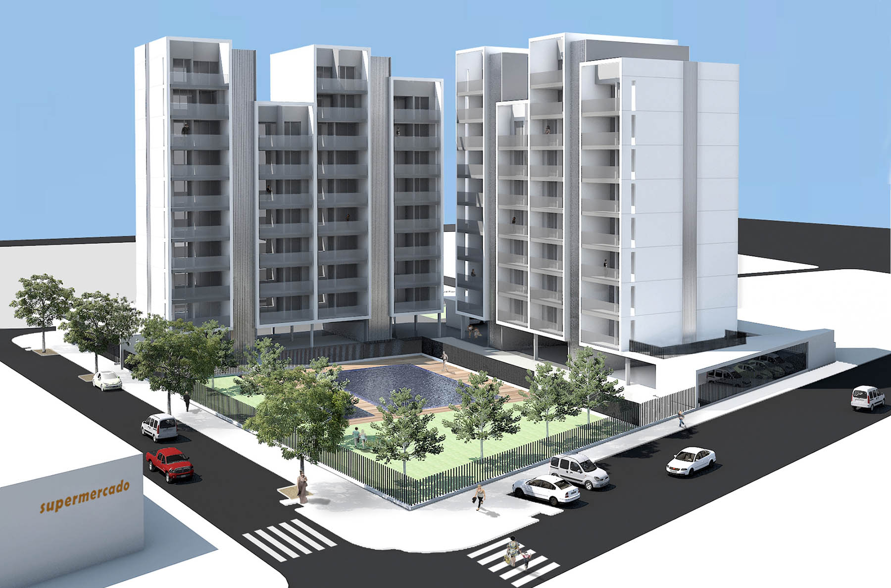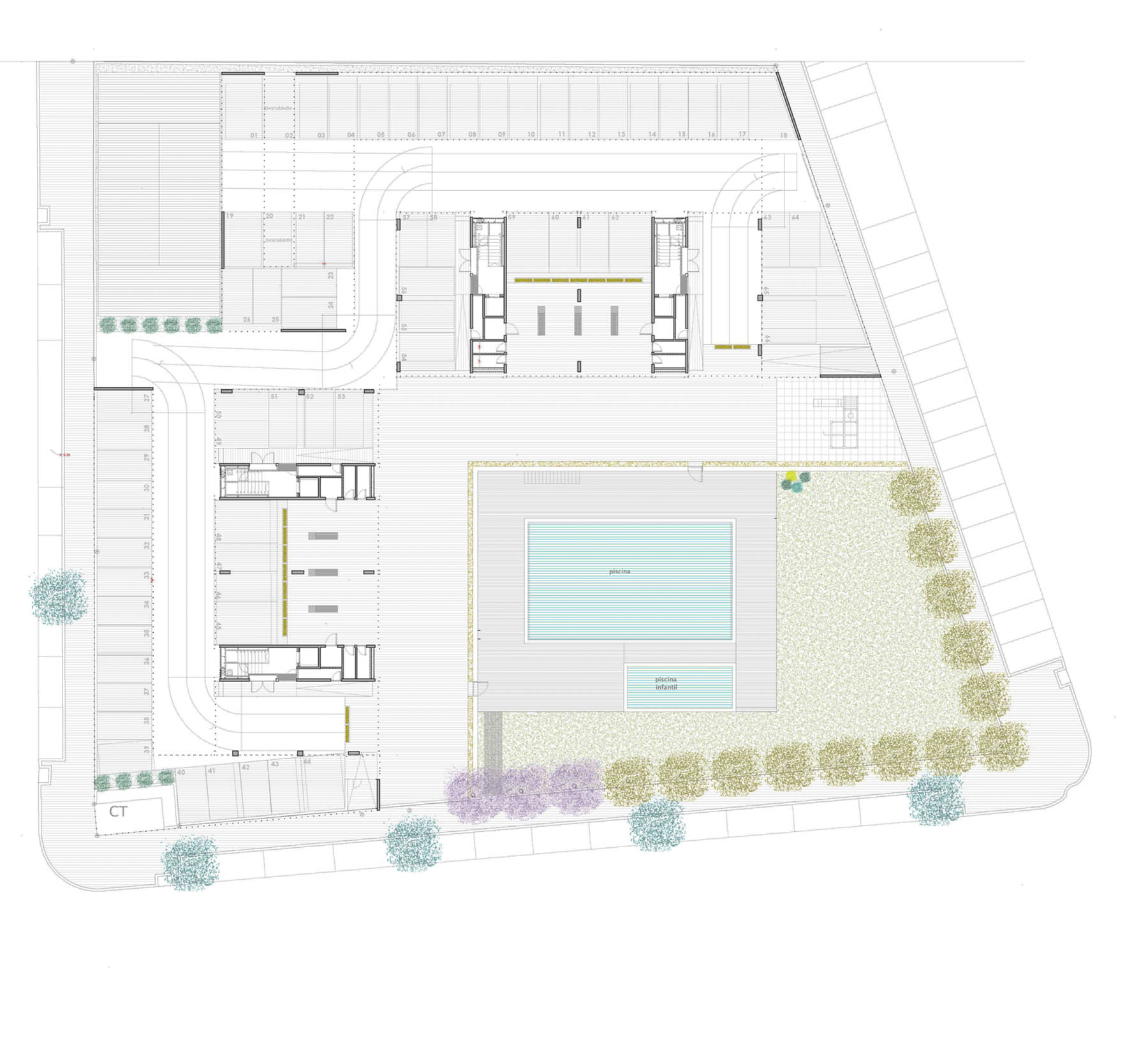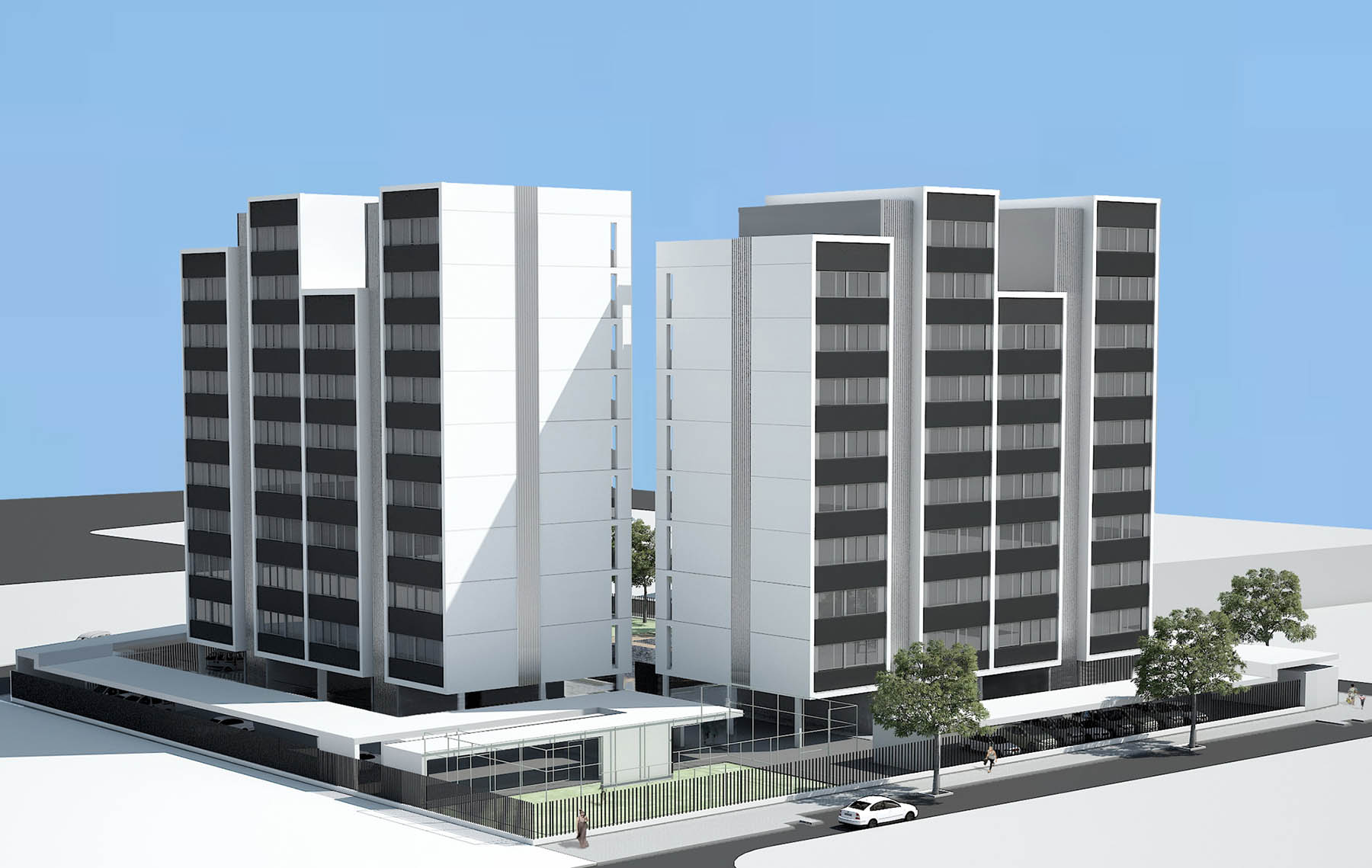 La propuesta pretende una imagen rotunda, dos volúmenes nítidos y bien aristado con una serie de prismas que responde a su contenido residencial, a sus amplias solanas protegidas y privatizadas de vistas. Identificando dos accesos por cada bloque que comunican con los núcleos verticales de comunicación, en los que se concentra un sistema compacto de escalera permite un núcleo denso y una rentable economía de medios, diseñado con criterios de máxima accesibilidad y con eliminación de barreras arquitectónicas en la relación entre las distintas partes y espacios a los cuales se puede llegar desde el acceso principal: batería de ascensores, accesos desde áreas de aparcamiento, paso hacia las zonas ajardinadas y las zonas deportivas o lúdicas.