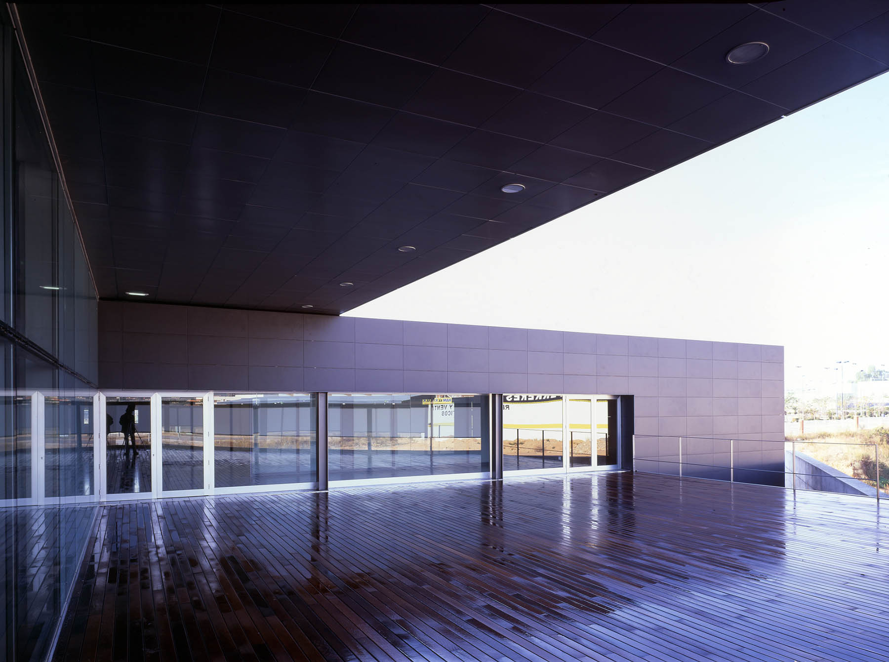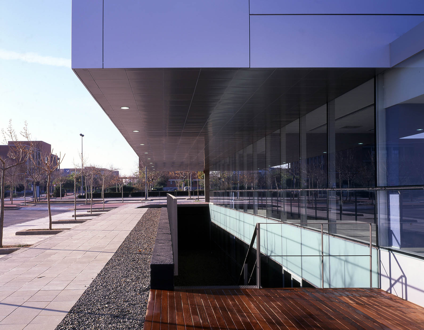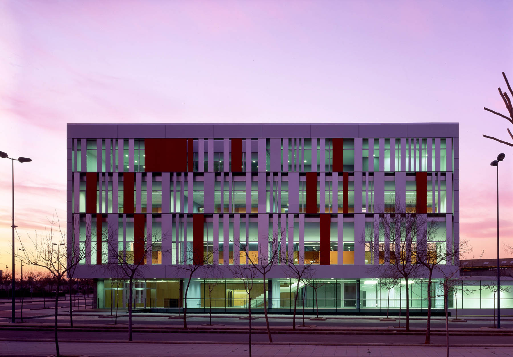 Los dos volúmenes están perfectamente diferenciados, tanto por su dimensión como por su definición material. El de menor altura se ajusta a la calle longitudinal (Sur) que es paralela al boulevard y se materializa mediante un revestimiento de placas de gres porcelánico (1,20×0,60 m) de color negro y textura mate y lisa. El volumen de dimensión mayor se apoya en el anterior y se gira sobre el lado Este para mostrar la fachada de mayor altura como el frente principal del conjunto. En este caso se materializa con un revestimiento de planchas de aluminio anodizado en su color natural para definir los testeros Norte y Sur y un sistema de planos acristalados con una protección de lamas de paneles de aluminio verticales que configuran las fachadas Este y Oeste.