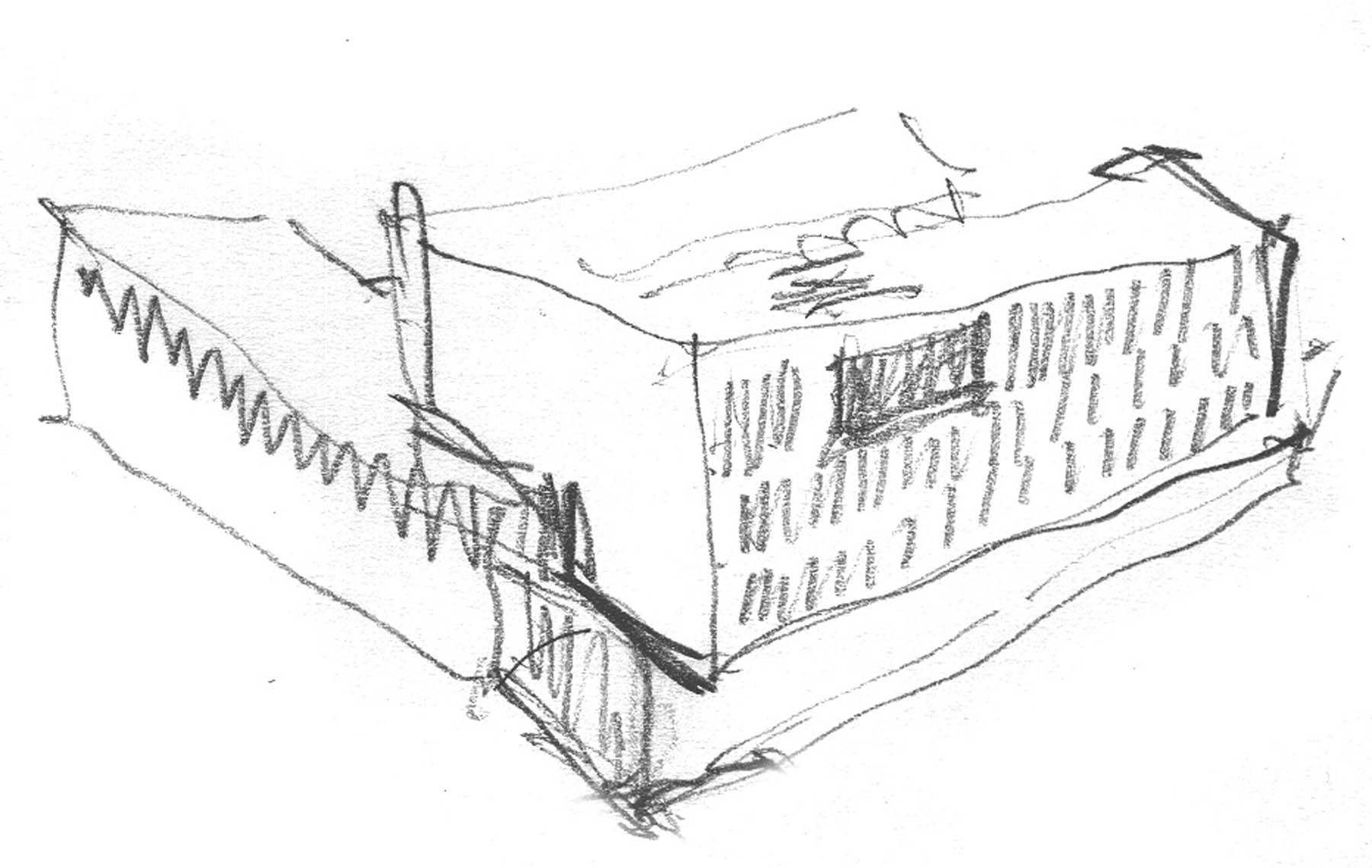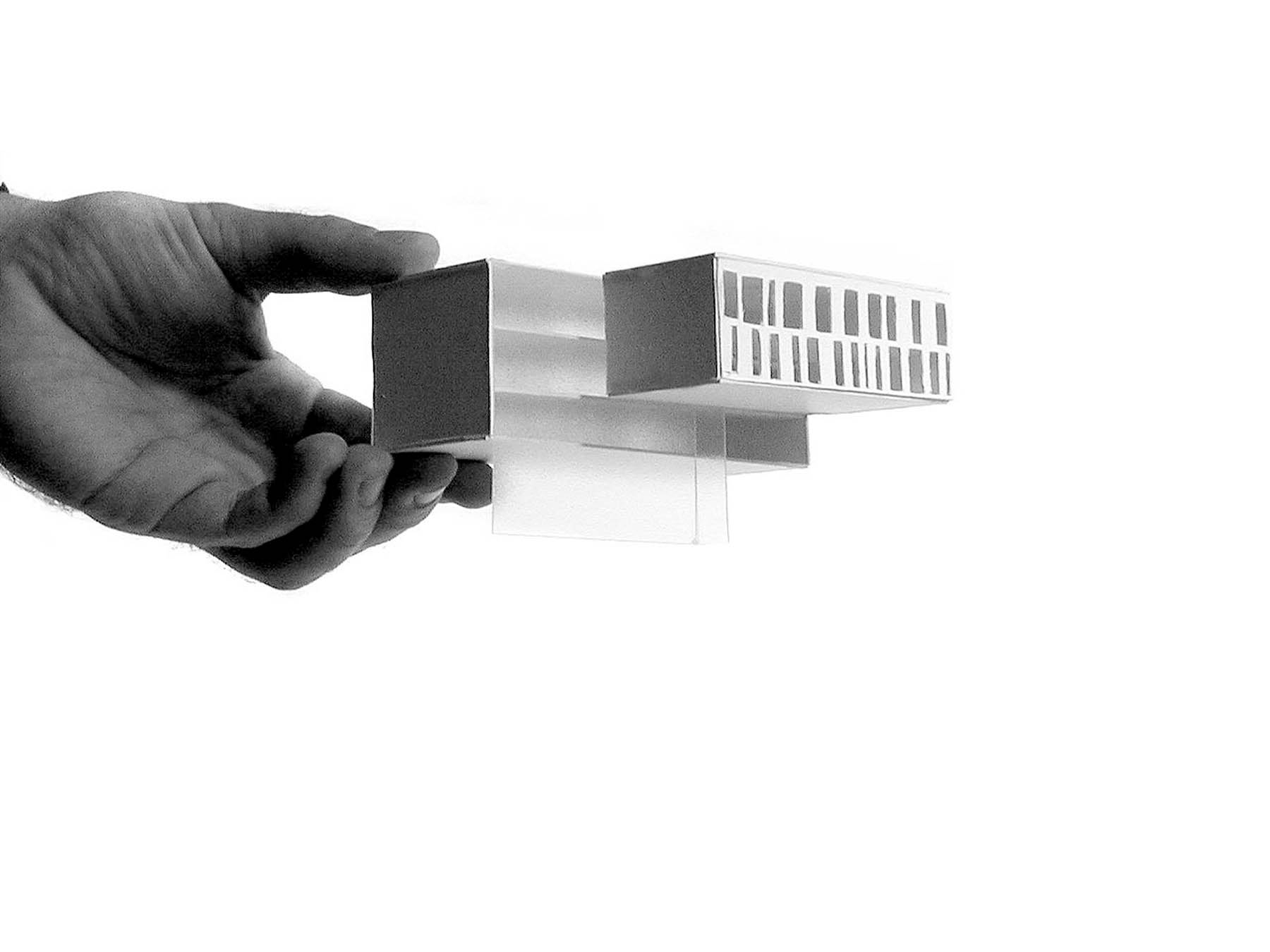 Se proponen dos volúmenes perpendiculares que se encuentran en el vértice S-E de la parcela reforzando su único ángulo recto: en ese punto ubicamos el acceso.