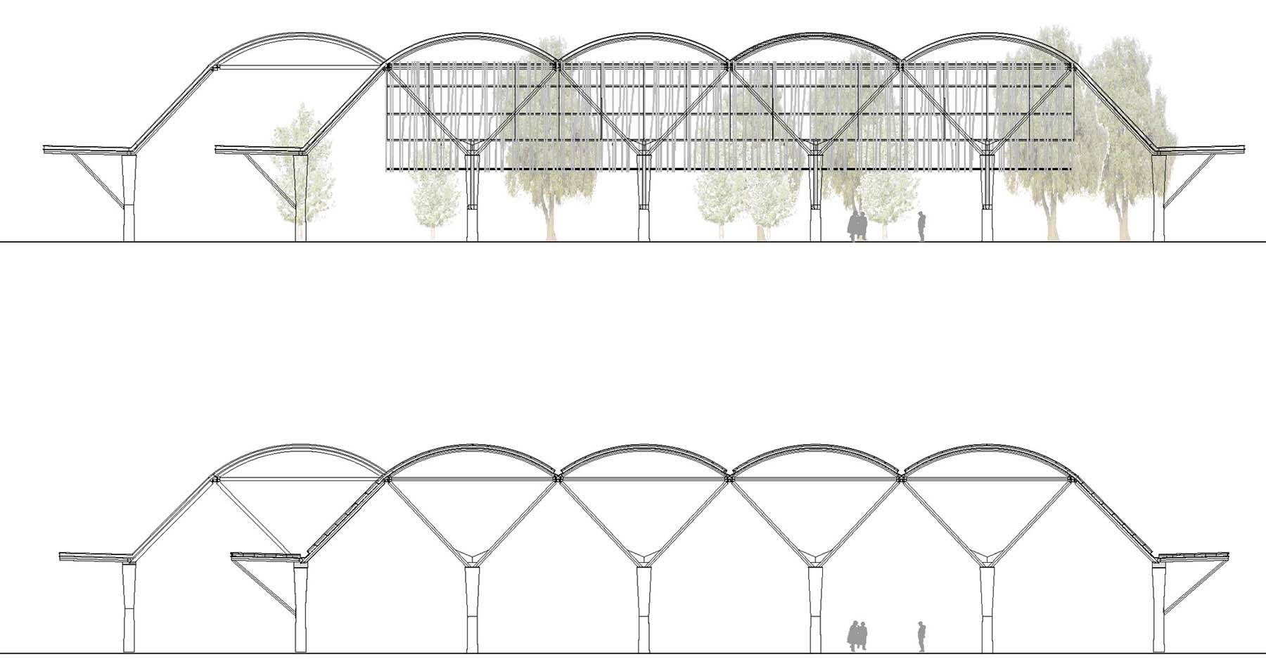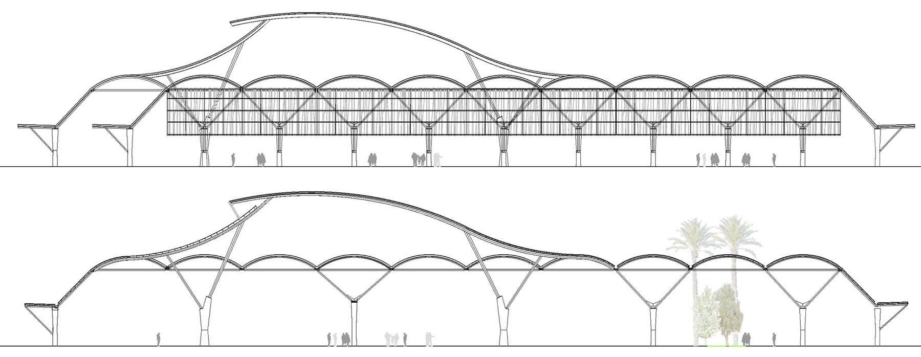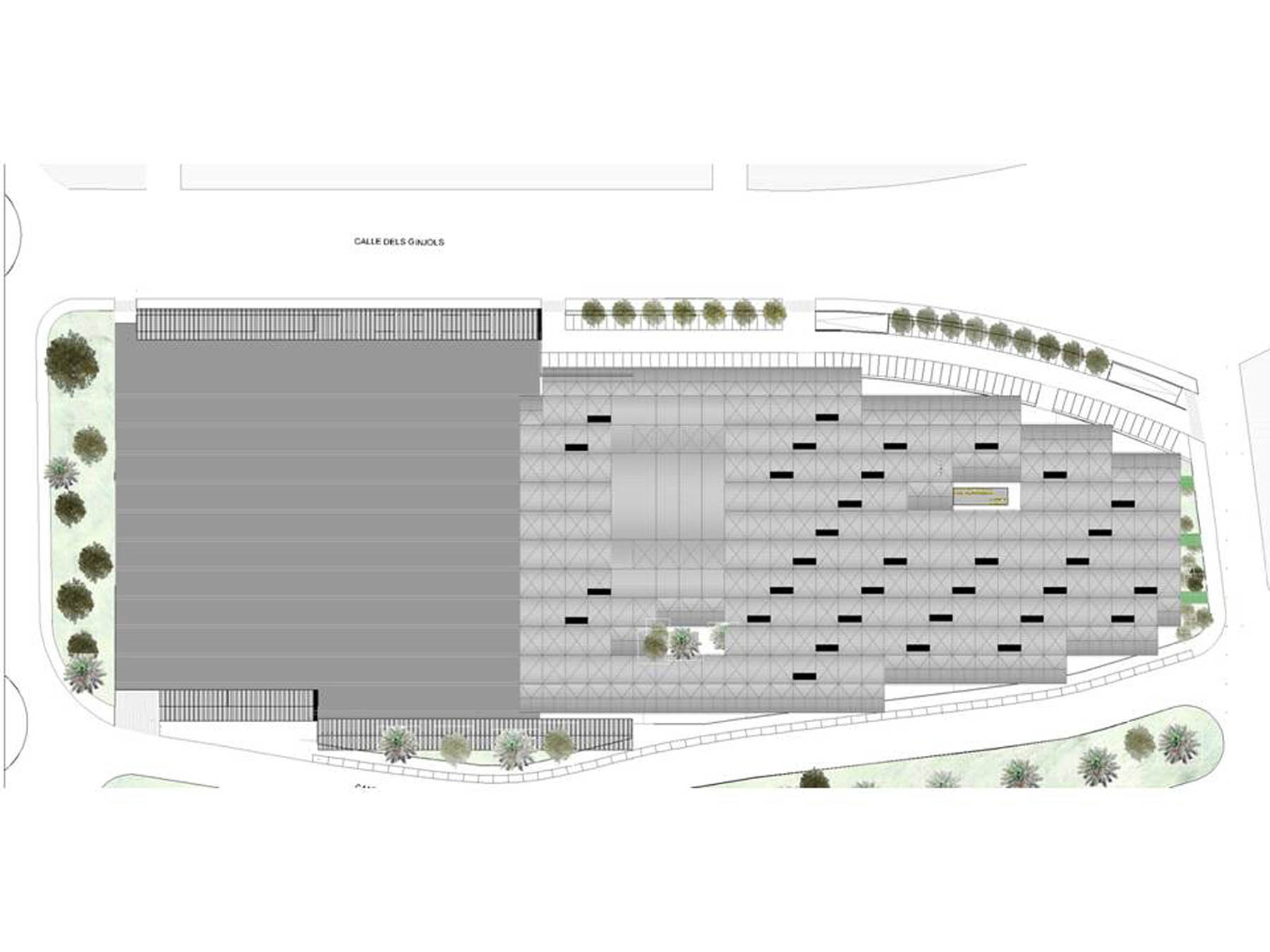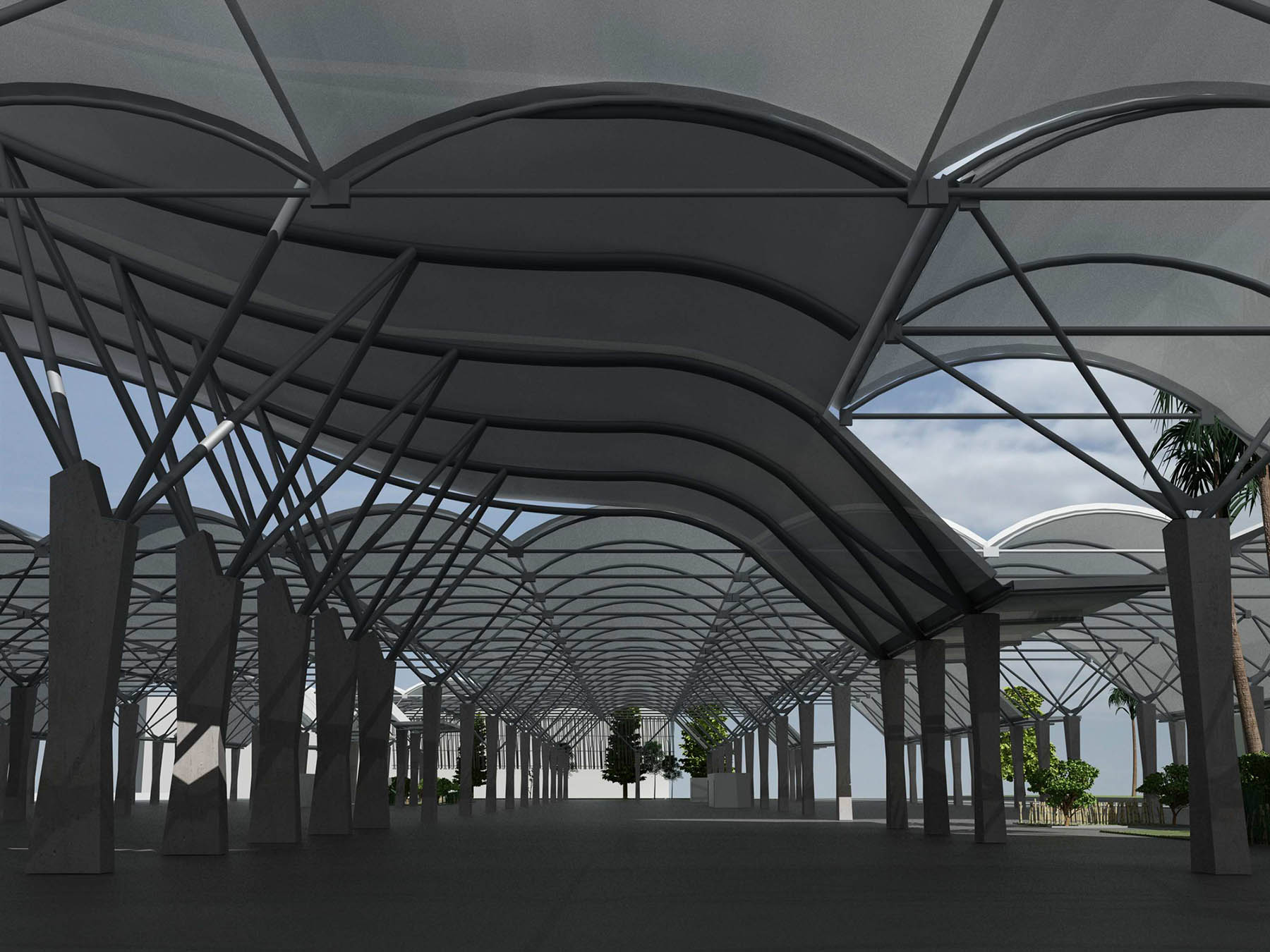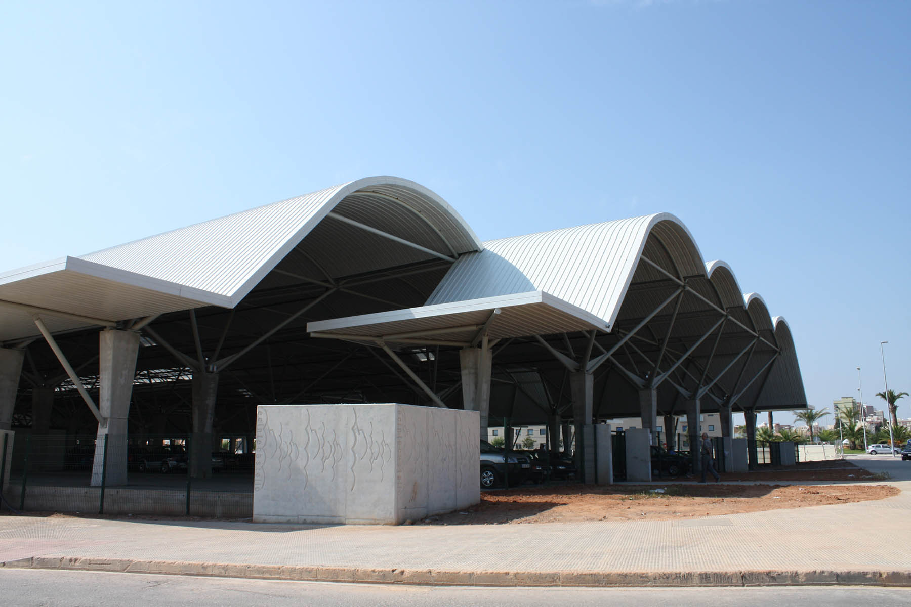 La estructura tubular arbórea se define a partir de una base de hormigón poliédrica y cuerpos superior de una pirámide invertida y cubierta de bóvedas continuas, que crea una malla de 17,00 x 9,50 m, con pilares cada 160 m2, lo que incide en esa sensación deseada de libertad, de espacio cubierto pero no constreñido. Dispuesto con calles de 4 metros en las dos direcciones, con 590 puestos cubiertos 6,00 m de fachada por 2,75 m de profundidad.